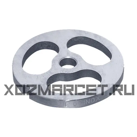 Решетка выполнена из нержавейки. Диаметр рабочих отверстий 14мм, используется для приготовления домашней колбасы, мант и других блюд